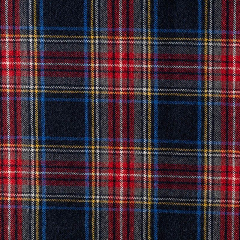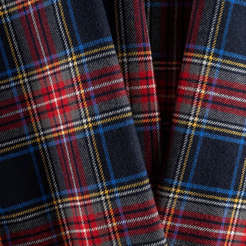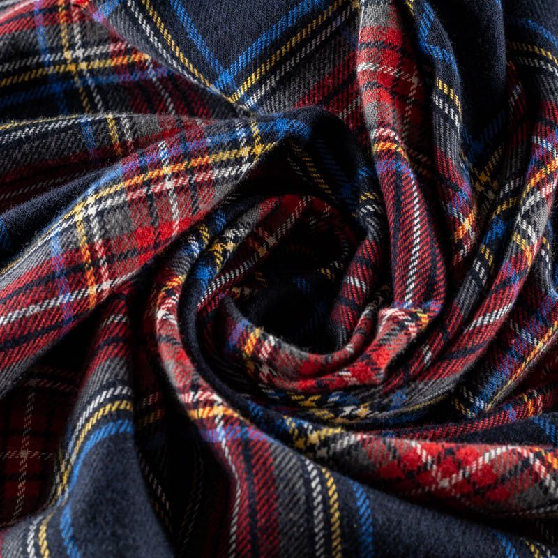 Ткань средней плотности, мягкая и приятная на ощупь, немного тянется, формоустойчива, хорошо драпируется и образует мягкие складки. Сочетание линий желтого, красного, голубого, хаки и белого цветов на темно-синем фоне образует сложную красивую клетку тартан. Ткань отлично подойдет на костюмы, юбки, брюки, платья, жакеты.