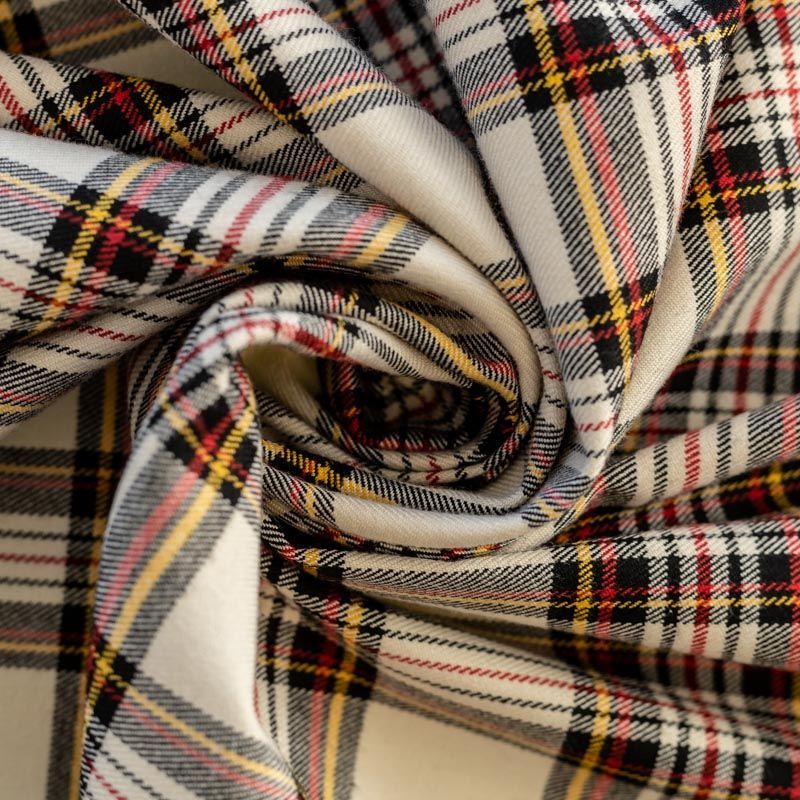 Костюмная шотландка плотная, но легкая и мягкая, приятная на ощупь, немного эластичная, хорошо драпируется и образует мягкие складки. Сочетание линий красного, желтого и черного оттенков образует сложную красивую многоцветную клетку. Ткань отлично подойдет на костюмы, юбки, брюки, платья, жакеты.