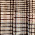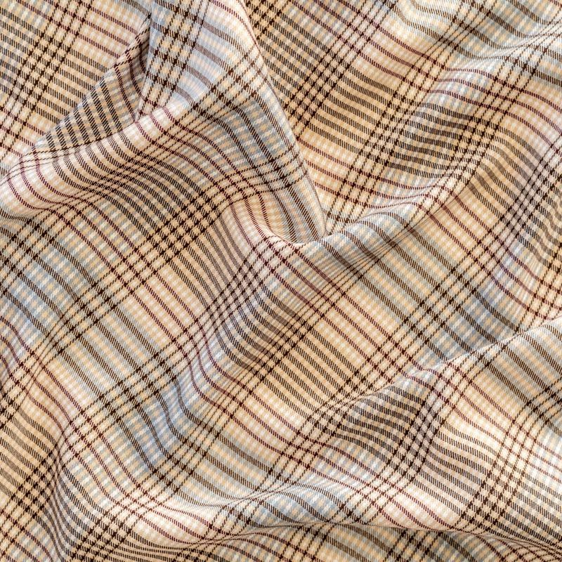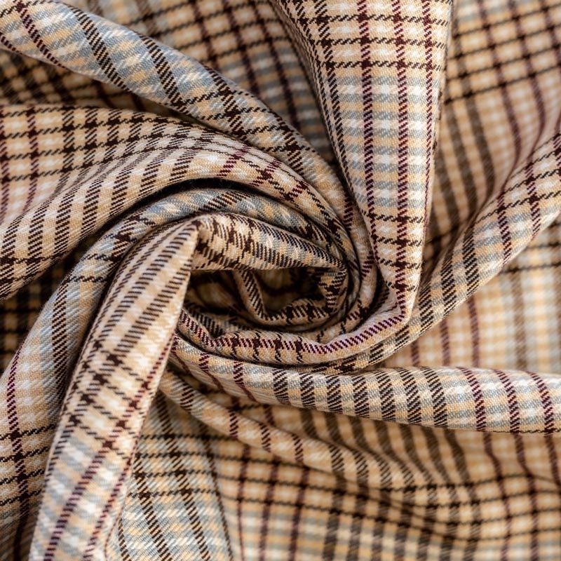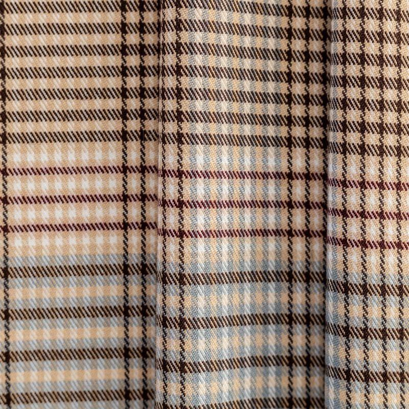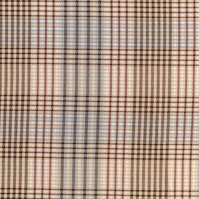 Сочетание линий голубого, шоколадного и кремового оттенков образует сложную красивую многоцветную клетку. Ткань отлично подойдет на костюмы, юбки, брюки, платья, жакеты.