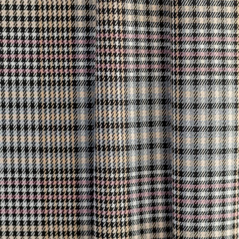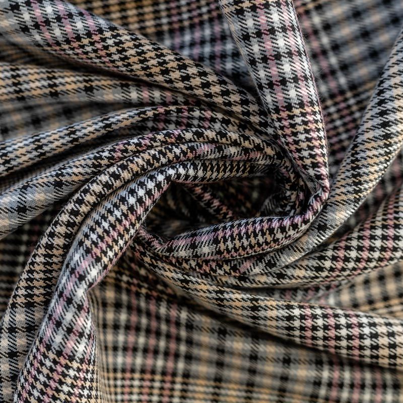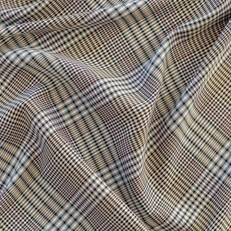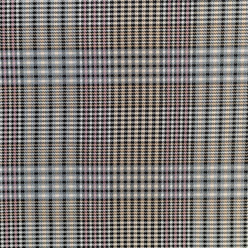 Сочетание линий серого, черного, розового и кремового оттенков в сочетании "гусиной лапкой" образует сложную красивую многоцветную клетку. Ткань отлично подойдет на костюмы, юбки, брюки, платья, жакеты.