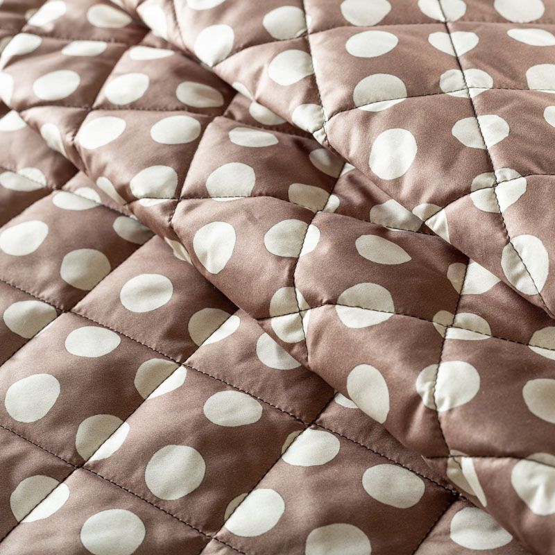 Трехслойная итальянская курточная ткань теплого серого оттенка в белый горох, простеганная не крупными ромбами размером 3х3 см. Нижний слой черного цвета, заменяет подклад, средний слой - синтепон, верхний слой - матовый полиэстер, напоминающий болонь. Ткань легкая, пластичная, хорошо драпируется. Прекрасно подойдет для пошива легких пальто, курток, бомберов, жилетов, накидок-кейпов, объемных сумок, одежды для домашних питомцев, туристического снаряжения.