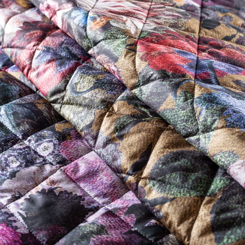 Трехслойная итальянская курточная ткань оттенка хаки с цветочным принтом, простеганная не крупными ромбами размером 3х3 см. Нижний слой черного цвета, заменяет подклад, средний слой - синтепон, верхний слой - красочный матовый полиэстер, напоминащий болонь. Ткань легкая, пластичная, хорошо драпируется и держит форму. Прекрасно подойдет для пошива легких пальто, курток, бомберов, жилетов, накидок-кейпов, объемных сумок, одежды для домашних питомцев, туристического снаряжения.