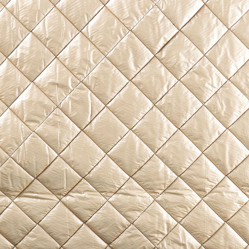 Трехслойная итальянская курточная ткань золотисто-бежевого оттенка с легким эффектом металлик, простеганная не крупными ромбами размером 3х3 см. Нижний, черного цвета, заменяет подклад и верхний слой - полиэстер, по качеству напоминает болонь, между ними синтепон. Ткань легкая, пластичная, хорошо драпируется. Прекрасно подойдет для пошива легких пальто, курток, бомберов, жилетов, накидок-кейпов, объемных сумок, одежды для домашних питомцев, туристического снаряжения.