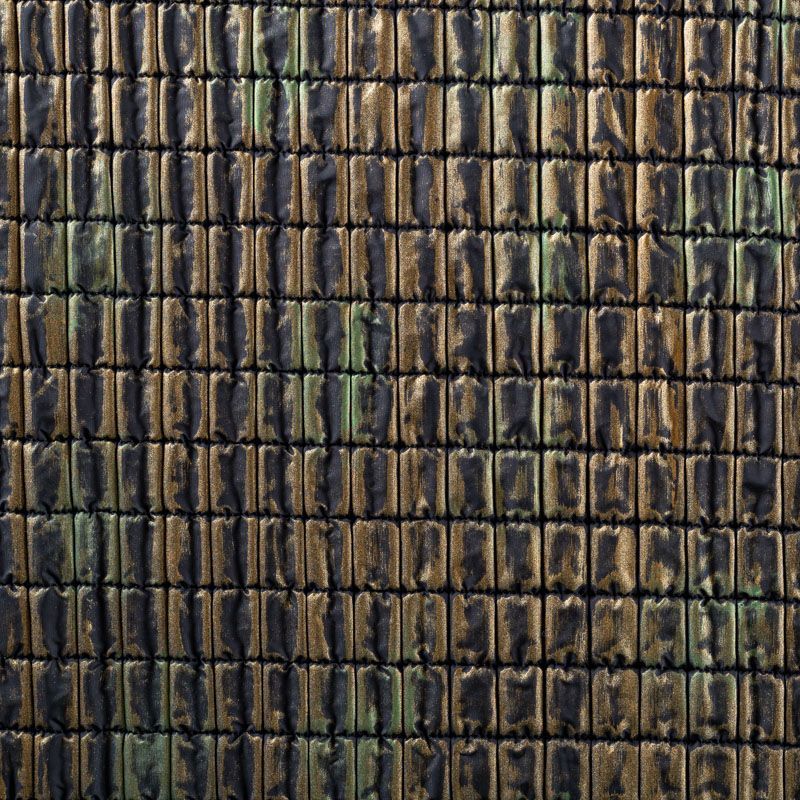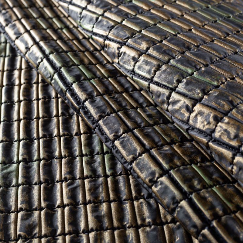 Оригинальная трехслойная итальянская курточная ткань состаренного золотистого оттенка с эффектом жатки, простеганная не крупными прямоугольниками. Нижний, черного цвета, заменяет подклад и верхний слой - полиэстер, по качеству напоминает болонь, а по фактуре кожу рептилии, между ними синтепон. Ткань легкая, пластичная, хорошо держит форму, отлично тянется по долевой, набирается на изделие объемом. Прекрасно подойдет для пошива легких пальто, курток, бомберов, жилетов, накидок-кейпов, объемных сумок, одежды для домашних питомцев, туристического снаряжения.