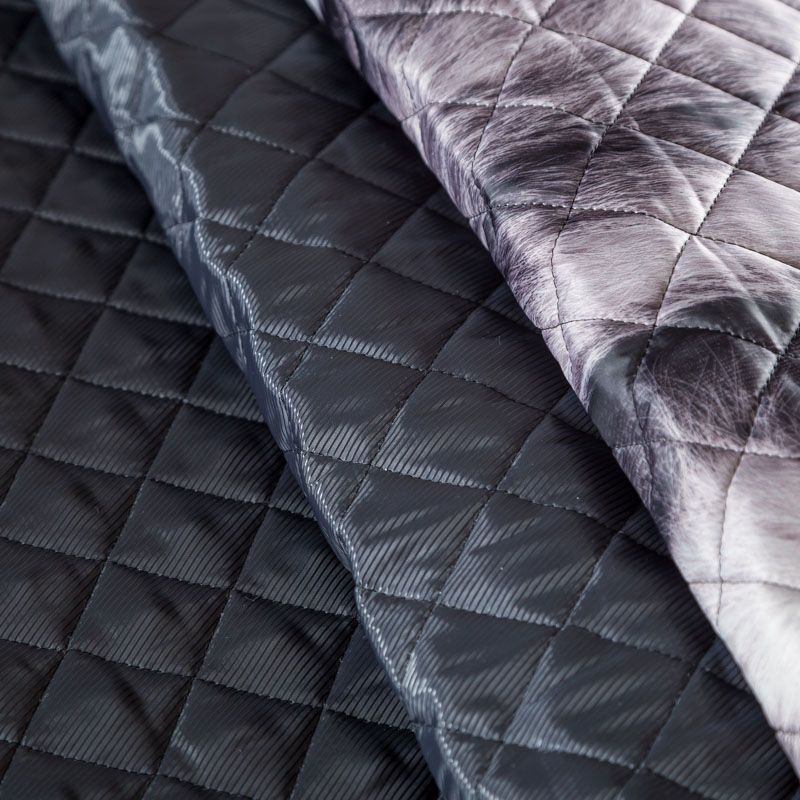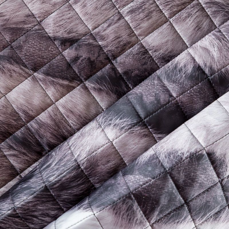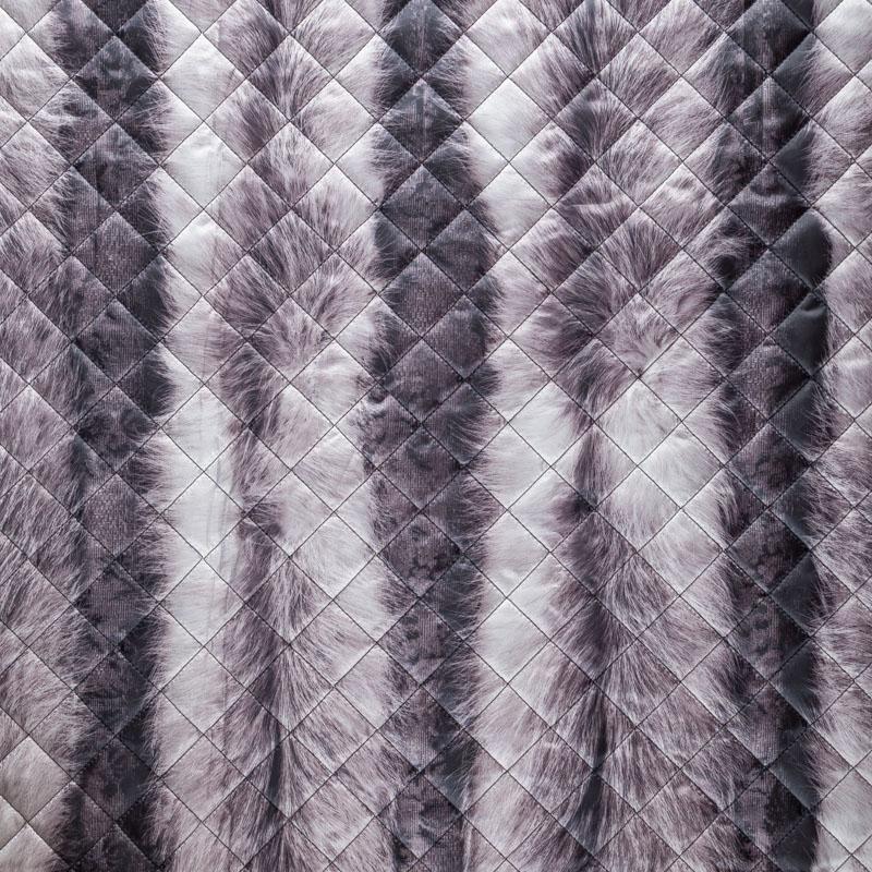 Трехслойная итальянская курточная ткань серого оттенка с принтом, имитирующим длиноворсый мех, простеганная не крупными ромбами. Нижний, черного цвета, заменяет подклад и верхний слой - полиэстер, по качеству напоминает болонь, между ними синтепон. Ткань легкая, пластичная, хорошо драпируется. Прекрасно подойдет для пошива легких пальто, курток, бомберов, жилетов, накидок-кейпов, объемных сумок, одежды для домашних питомцев, туристического снаряжения.
