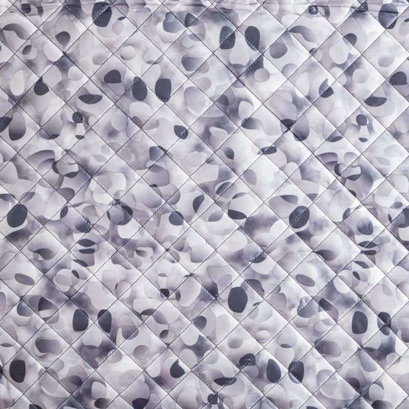 Трехслойная итальянская курточная ткань серого оттенка с абстрактным принтом, простеганная не крупными ромбами. Нижний, черного цвета, заменяет подклад и верхний слой - полиэстер, по качеству напоминает болонь, между ними синтепон. Ткань легкая, пластичная, хорошо драпируется. Прекрасно подойдет для пошива легких пальто, курток, бомберов, жилетов, накидок-кейпов, объемных сумок, одежды для домашних питомцев, туристического снаряжения.