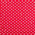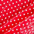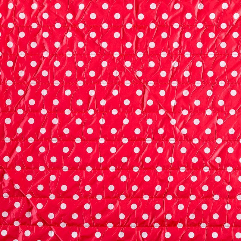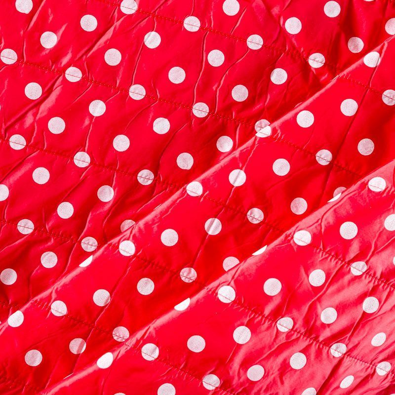 Двухслойная курточная ткань красного оттенка в белый горох, простеганная вертикальными линиями вдоль кромки. Нижний слой - синтепон, верхний - полиэстер, по качеству напоминает болонь. Очень мягкая и легкая, пластичная, хорошо драпируется. Прекрасно подойдет для  пошива легких пальто, курток, жилетов, накидок-кейпов, объемных сумок.