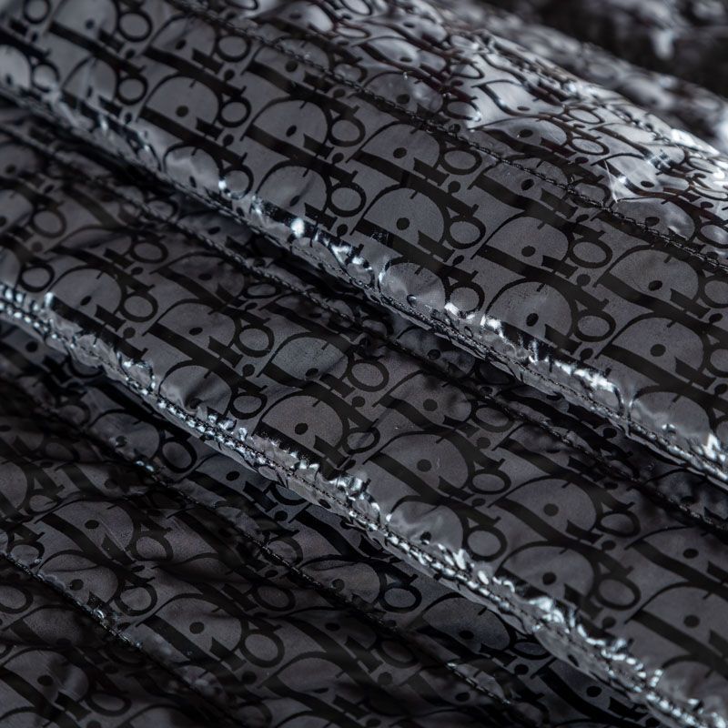 Итальянская двухслойная курточная ткань черного цвета с глитерным принтом лого известного бренда, простеганная вертикальными линиями вдоль кромки. Нижний слой - синтепон, верхний - полиэстер, по качеству напоминает болонь. Очень мягкая и легкая, пластичная, хорошо драпируется. Прекрасно подойдет для  пошива легких пальто, курток, жилетов, накидок-кейпов, комбинезонов, объемных сумок, одежды для домашних питомцев, туристического снаряжения.