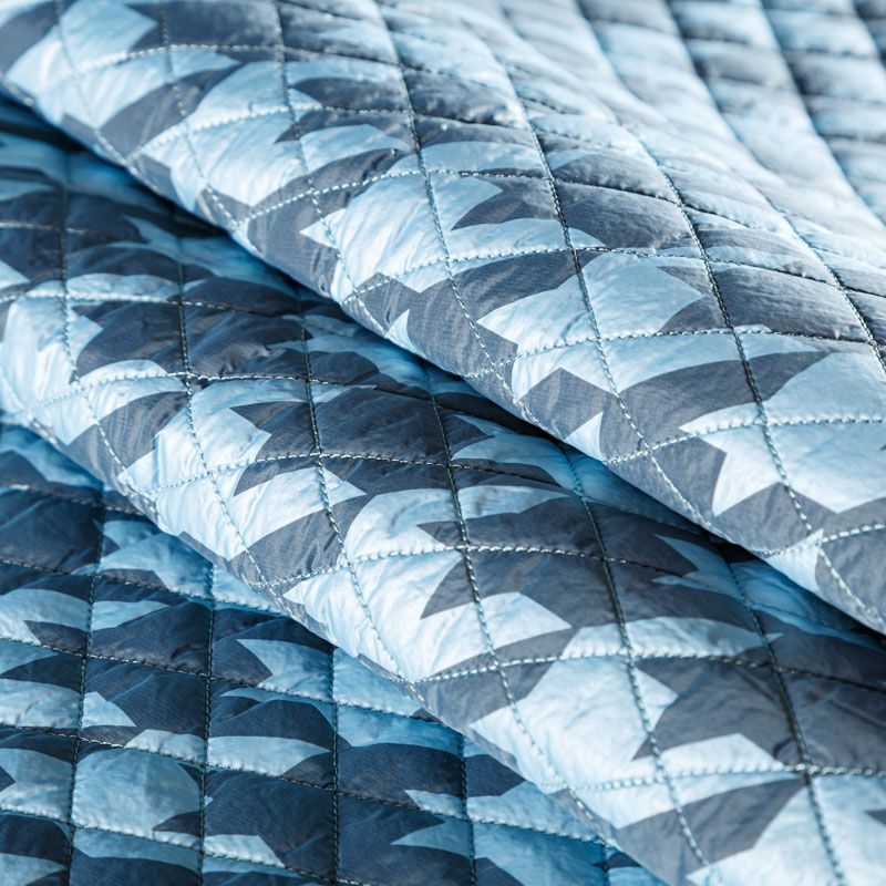 Двухслойная курточная ткань серо-голубого оттенка с необычным для стежки принтом - гусиная лапка, простеганная не крупными ромбами размером 4х4 см. Нижний слой - синтепон, верхний - полиэстер, по качеству напоминает болонь. Очень мягкая и легкая, пластичная, хорошо драпируется. Прекрасно подойдет для  пошива легких пальто, курток, жилетов, накидок-кейпов, объемных сумок.