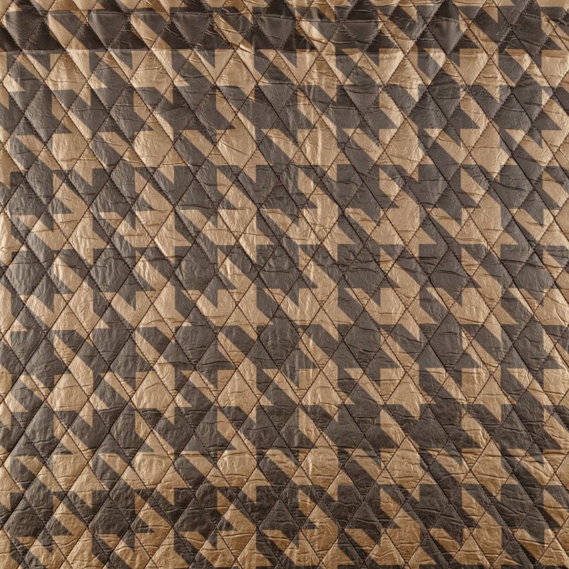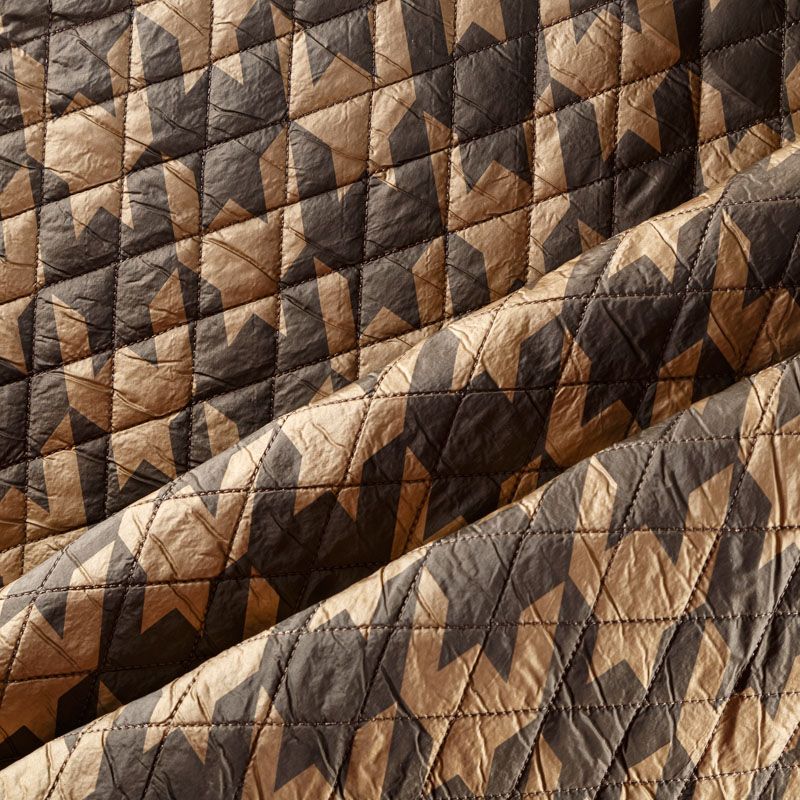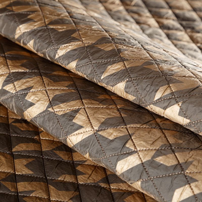Двухслойная курточная ткань золотистого цвета с необычным для стежки принтом - гусиная лапка, простеганная не крупными ромбами размером 4х4 см. Нижний слой - синтепон, верхний - полиэстер, по качеству напоминает болонь. Очень мягкая и легкая, пластичная, хорошо драпируется. Прекрасно подойдет для  пошива легких пальто, курток, жилетов, накидок-кейпов, объемных сумок.