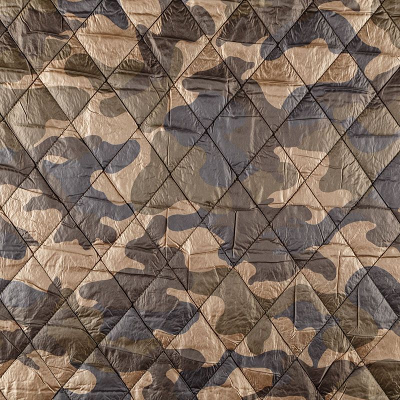 Двухслойная курточная ткань золотистого оттенка с оригинальным камуфлированным принтом, простеганная не крупными ромбами размером 4х4 см. Нижний слой - синтепон, верхний - полиэстер, по качеству напоминает болонь. Очень мягкая и легкая, пластичная, хорошо драпируется. Прекрасно подойдет для пошива легких пальто, курток, жилетов, накидок-кейпов, объемных сумок.