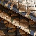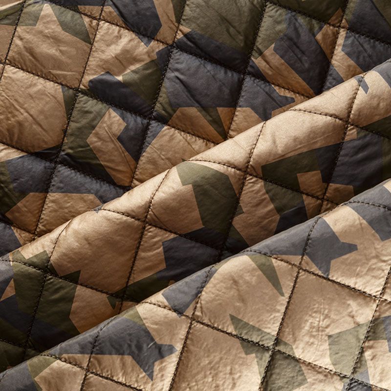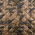 Двухслойная курточная ткань золотистого цвета с геометрическим принтом в зелено-черной гамме, простеганная не крупными ромбами размером 4х4 см. Нижний слой - синтепон, верхний - полиэстер, по качеству напоминает болонь. Очень мягкая и легкая, пластичная, хорошо драпируется. Прекрасно подойдет для  пошива легких пальто, курток, жилетов, накидок-кейпов, объемных сумок.