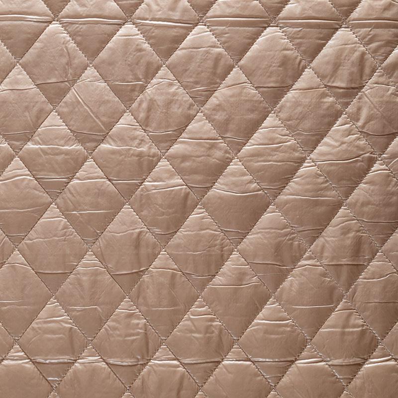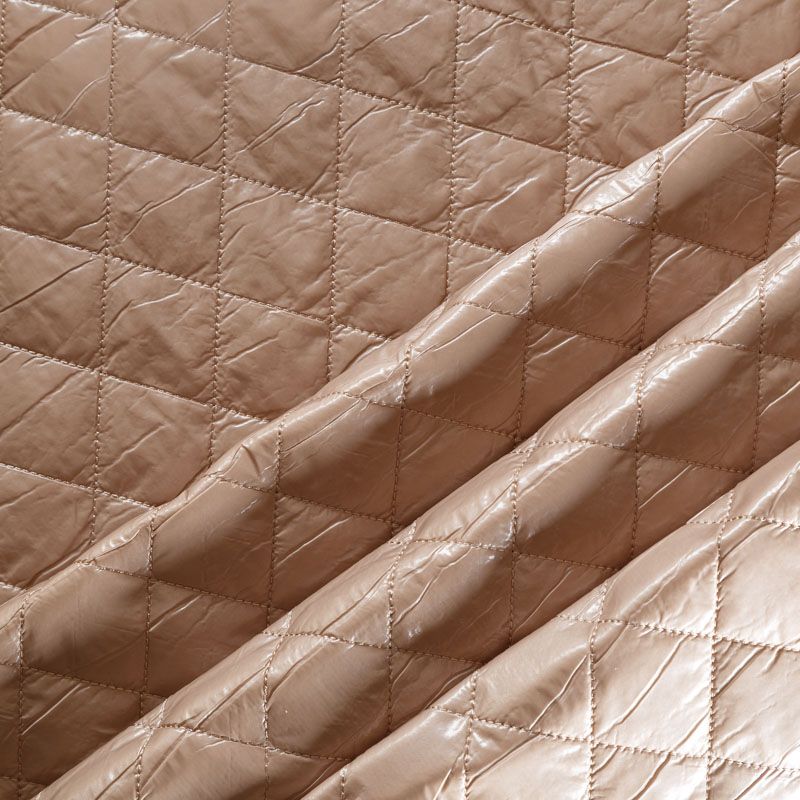 Трехслойная курточная ткань бежевого оттенка, простеганная не крупными ромбами. Нижний слой - матовый фактурный полиэстер, средний - тонкий синтепон, верхний - глянцевая гладкая плащевка. Очень мягкая и легкая, пластичная, хорошо драпируется. Прекрасно подойдет для пошива легких пальто, бомберов, парки, курток, жилетов, накидок-кейпов, объемных сумок.