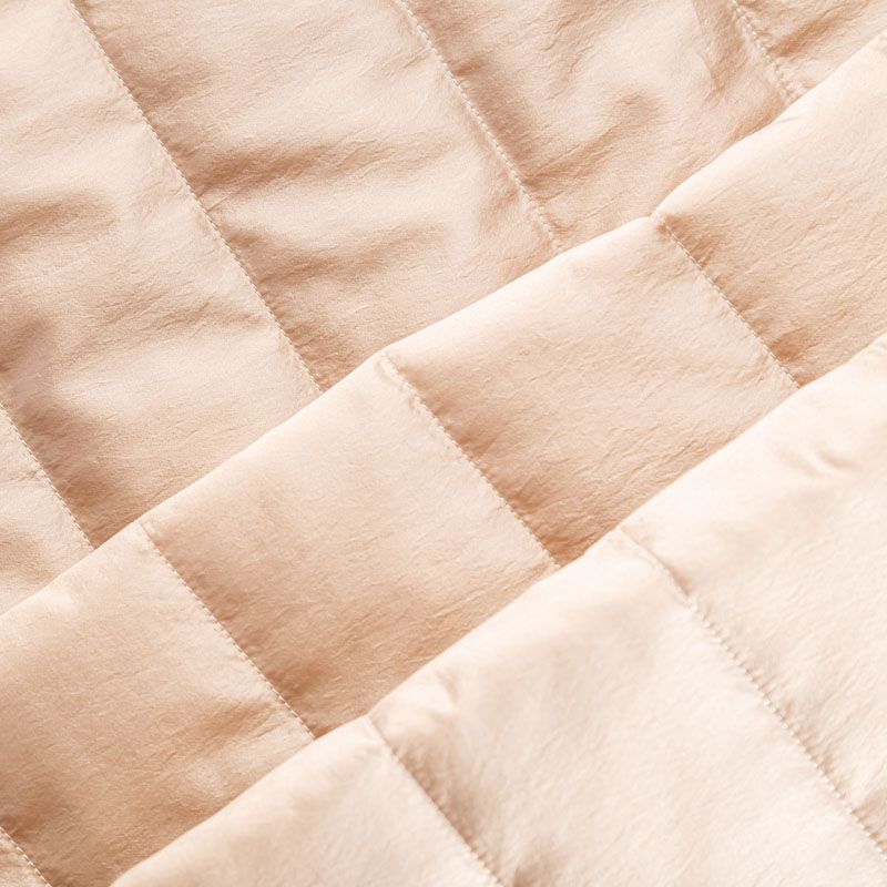 Итальяская двухслойная курточная ткань золотисто-бежевого оттенка, простеганная широкими полосами вдоль кромки. Нижний слой - воздушный синтепоновый утеплитель, верхний - матовая, слегка жатая плотная плащевая ткань. Очень мягкая и легкая, пластичная, хорошо драпируется. Прекрасно подойдет для  пошива легких пальто, бомберов, парки, курток, жилетов, накидок-кейпов, объемных сумок.
