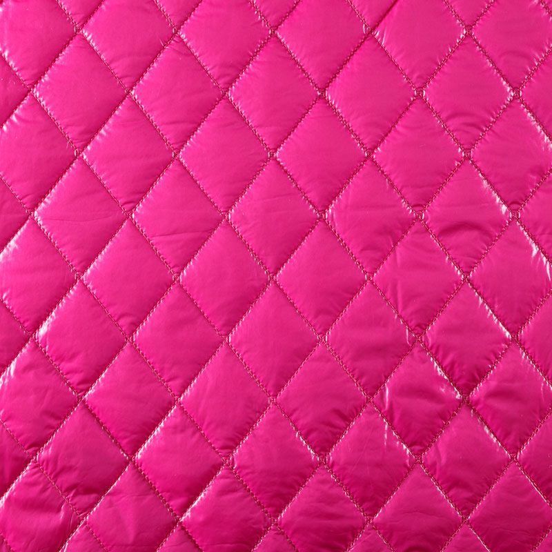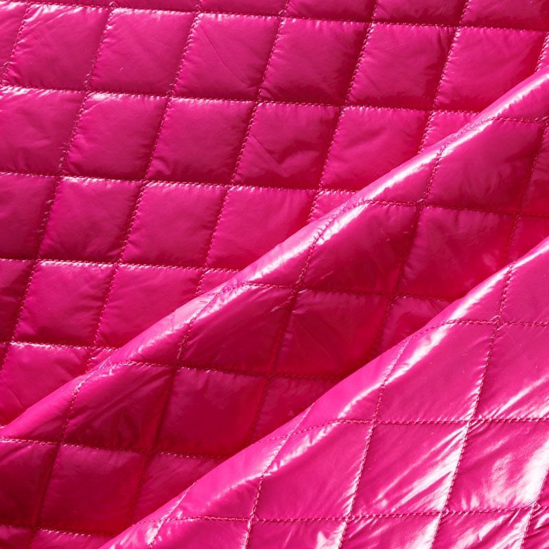 Трехслойная курточная стежка ярко-розового цвета, простеганная не крупными ромбами. Верхний слой - полиэстер, по качеству напоминающий болонь, средний слой - синтепон, нижний слой - подкладочная ткань в тон лицевой. Очень мягкая и легкая, пластичная, хорошо драпируется. Прекрасно подойдет для пошива легких пальто, курток, жилетов, накидок-кейпов, объемных сумок.