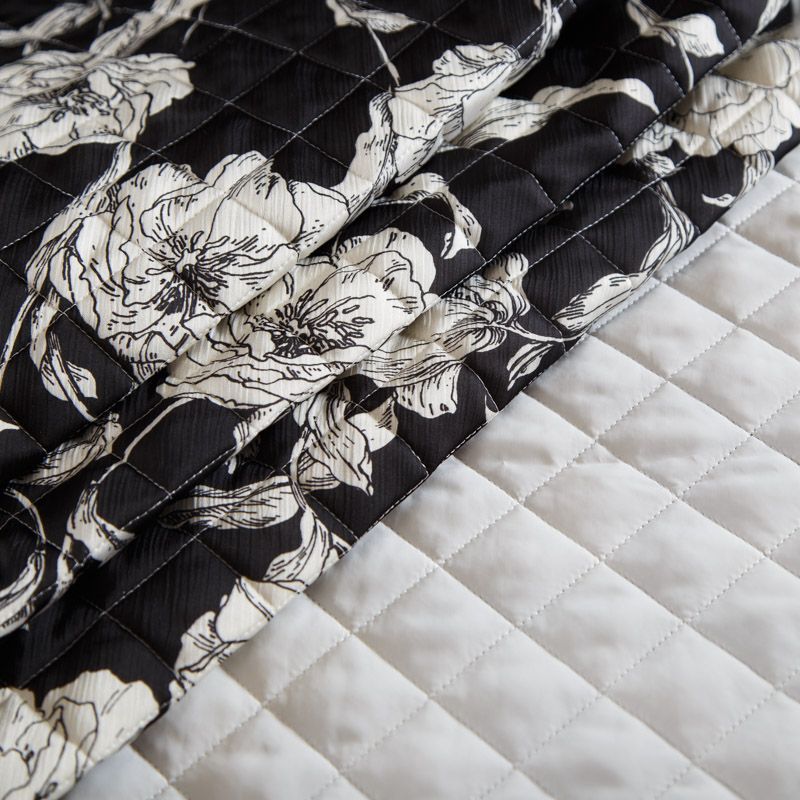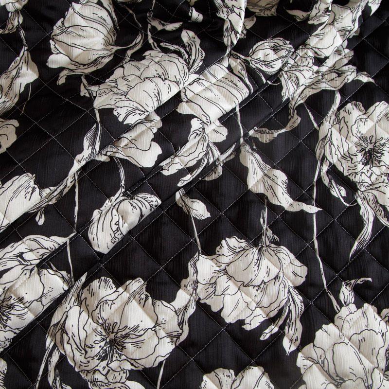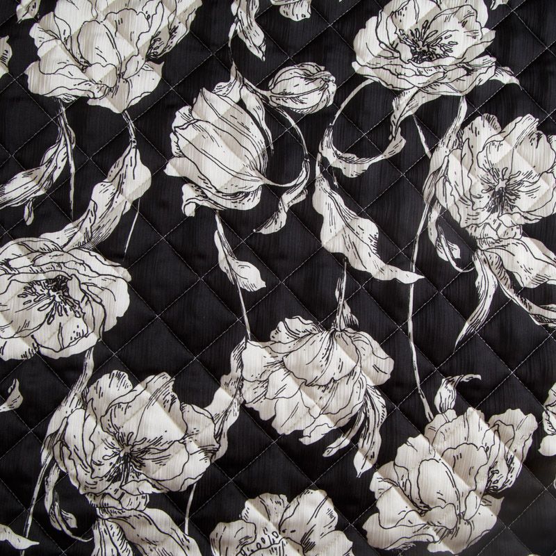 Итальянская трехслойная курточная ткань черного цвета с контрастным цветочным принтом, простеганная ромбами. Нижний слой - гладкий матовый полиэстер белого цвета, средний слой - синтепон, верхний - принтованный креп-шифон. Очень мягкая и легкая, пластичная, хорошо драпируется. Прекрасно подойдет для пошива легких пальто, бомберов, парки, курток, жилетов, накидок-кейпов, объемных сумок.
