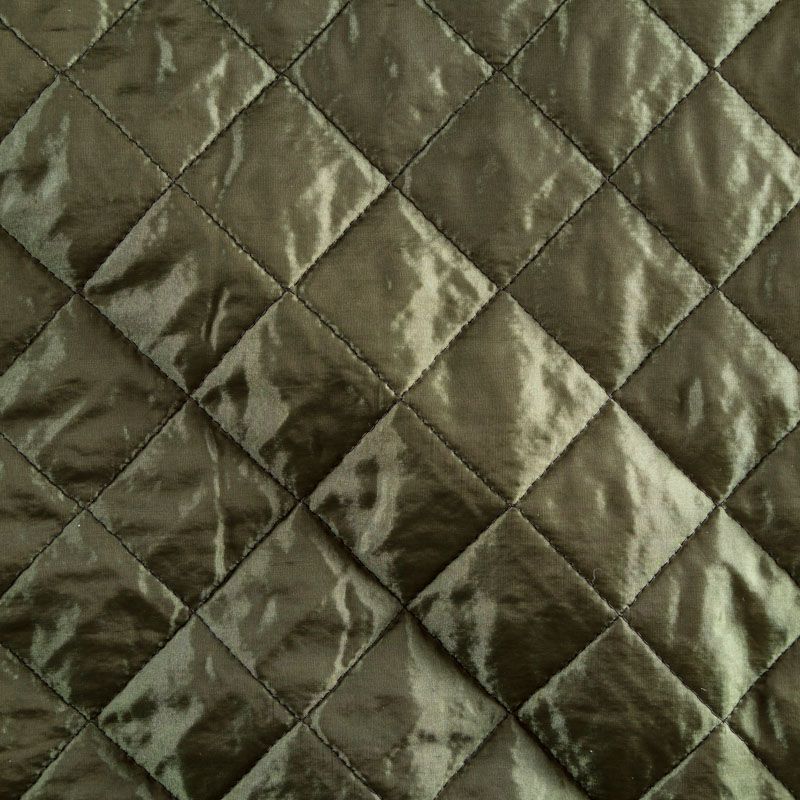 Двухслойная курточная ткань оттенка зеленого хаки с легким блеском, простеганная не крупными ромбами размером 3х3 см. Нижний слой - синтепон, верхний - полиэстер, по качеству напоминает болонь. Очень мягкая и легкая, пластичная, хорошо драпируется. Прекрасно подойдет для пошива легких пальто, курток, жилетов, накидок-кейпов, объемных сумок.