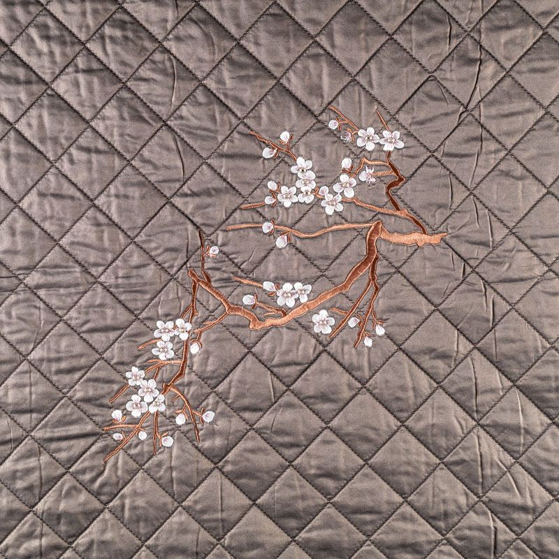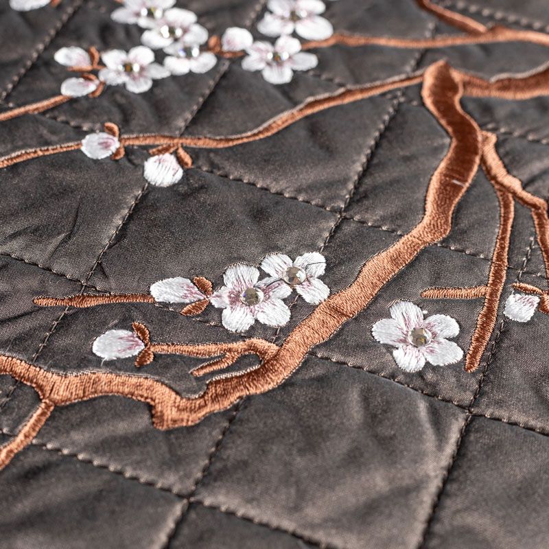 Курточный купон на синтепоне и подкладке, простеганный не крупными ромбами размером 3,5х3,5 см. С лицевой стороны тонкая, но прочная плащевая ткань с вышивкой в виде цветущей ветки сакуры, с изнаночной - однотонная ткань бежевого оттенка. Материал мягкий, объемный и "воздушный", хорошо держит форму и подойдет для пошива легких пальто, курток, жилетов, накидок-кейпов, парки.