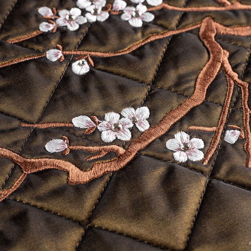 Курточный купон на синтепоне и подкладке, простеганный не крупными ромбами размером 3,5х3,5 см. С лицевой стороны тонкая, но прочная плащевая ткань с вышивкой в виде цветущей ветки сакуры, с изнаночной - желто-бежевая ткань с полоску. Материал мягкий, объемный и "воздушный", хорошо держит форму и подойдет для пошива легких пальто, курток, жилетов, накидок-кейпов, парки.
