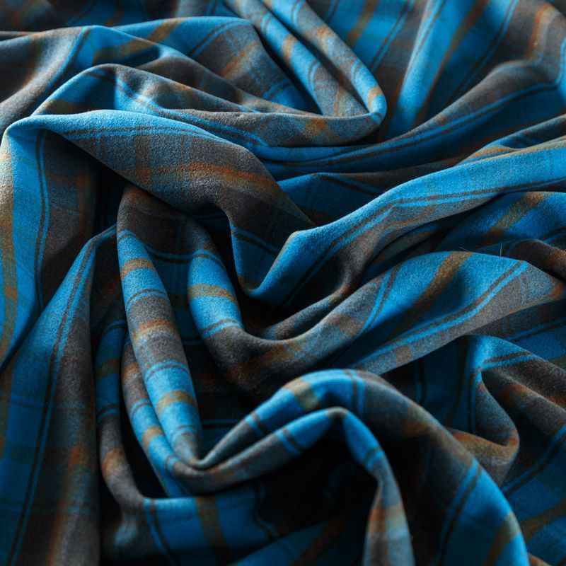 Пальтовая ткань в сине-голубом оттенке в клетку. Ткань плотная, достаточно теплая, комфортная для одежды на сезон осень-зима. Полотно имеет короткий ворс. Мягкое и нежное на ощупь, не толстое и не тяжелое, хорошо держит форму. Прекрасно подойдет для пошива женских пальто, теплых костюмов, кейпов, мягких бомберов, жилетов и головных уборов.