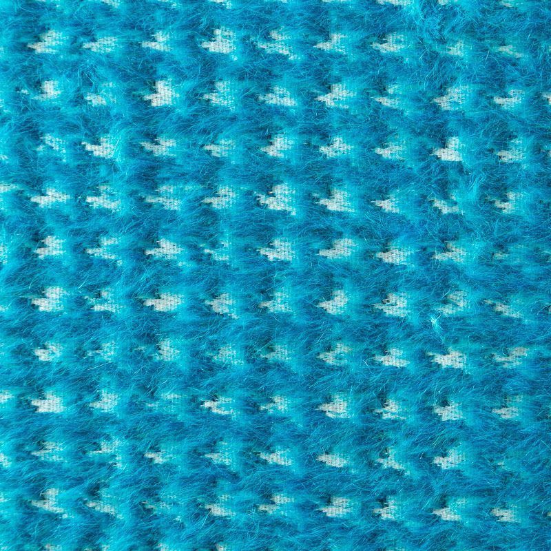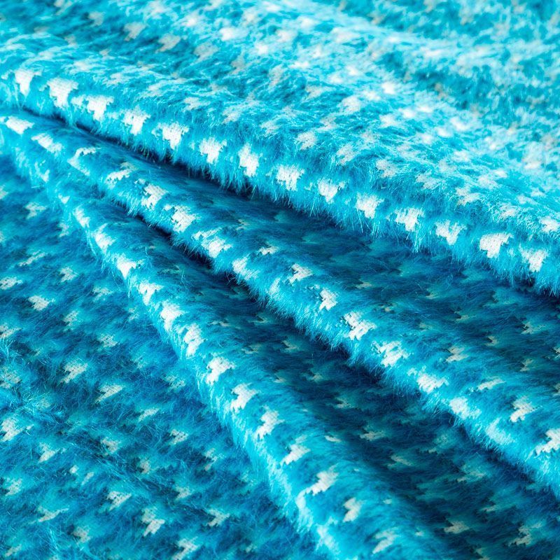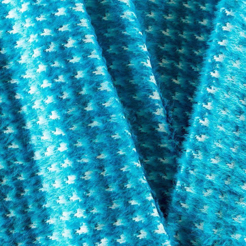 Пальтовая итальянская шерсть на хлопковой основе в ярком бирюзовом оттенке с жаккардовым узором гусиная лапка. Ткань плотная, достаточно теплая, комфортная для одежды на сезон осень-зима. Полотно имеет средний ворс. Мягкое и нежное на ощупь, не толстое и не тяжелое, хорошо держит форму. Прекрасно подойдет для пошива женских пальто, теплых костюмов, кейпов, мягких бомберов, жилетов и головных уборов.