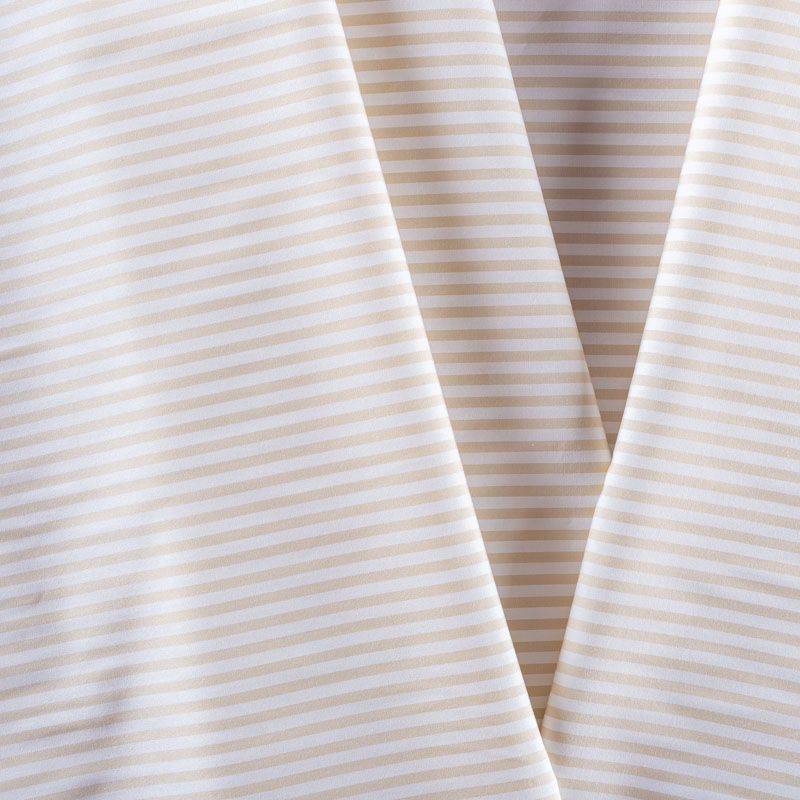 Итальянский плательно-рубашечный хлопок в узкую полоску бежево-оливкового оттенка. Ткань мягкая, лёгкая, непрозрачная, пластичная и приятная к телу, хорошо драпируется, имеет гладкую матовую поверхность и сатиновое плетение. Прекрасно подойдет как для пошива платья-рубашки, сарафана, платьев различных фасонов, туники, топа, летнего костюма, комбинезона.
