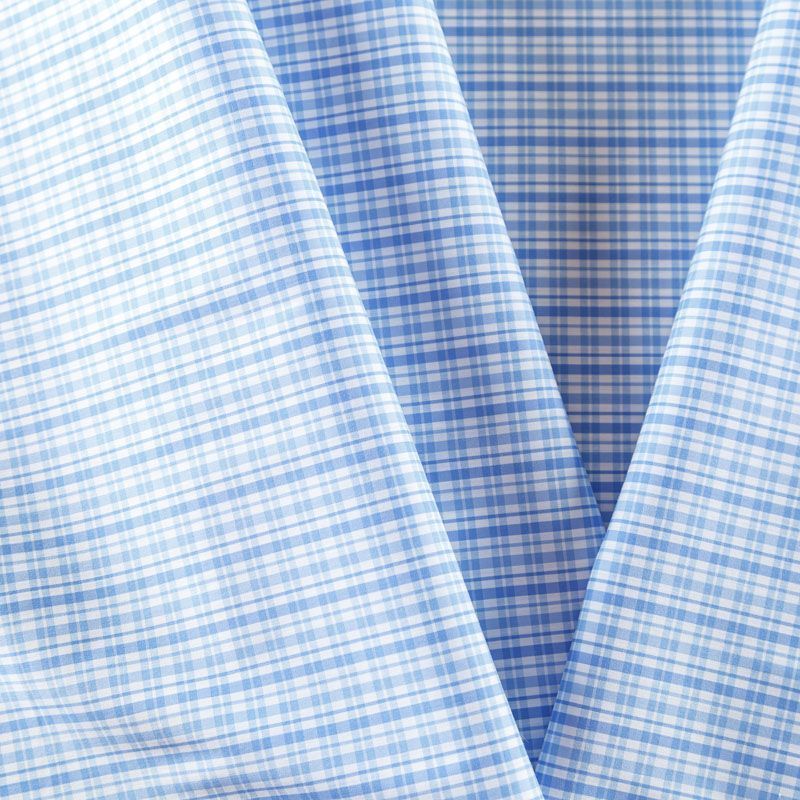 Итальянский плательно-рубашечный смесовый хлопок с эластаном в голубую клетку. Ткань мягкая, лёгкая, слегка прозрачная, пластичная и приятная к телу, хорошо драпируется, имеет гладкую матовую поверхность и сатиновое плетение. Прекрасно подойдет как для пошива платья-рубашки, сарафана, платьев различных фасонов, туники, топа, летнего костюма, комбинезона, детской и мужской одежды.