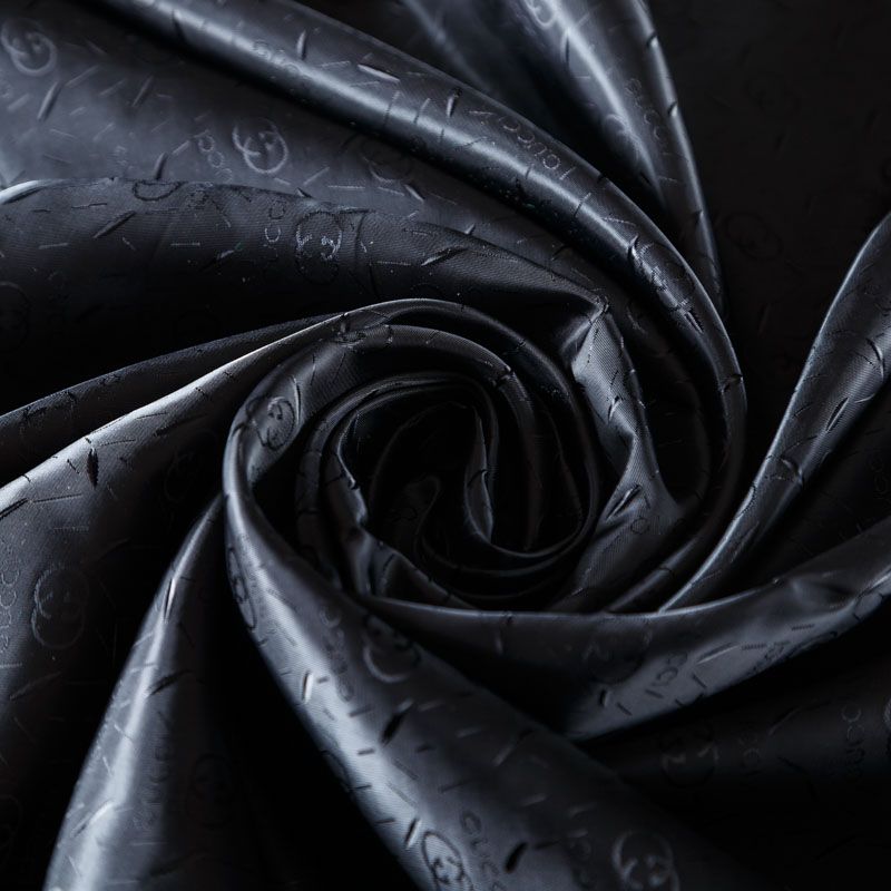 Смесовая подкладочная ткань черного оттенка с жаккардовым узором и красивым лоском. Полотно средней плотности, легкое, не просвечивает, хорошо скользит, не тянется. Подойдет для изготовления таких изделий, как пальто, костюмы, куртка, шуба, платье, жакет.