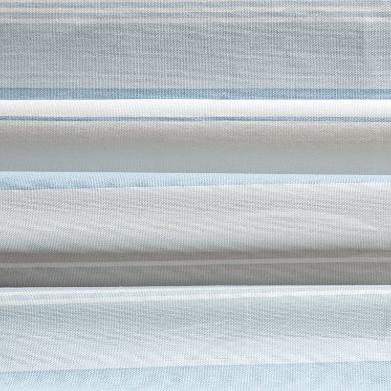 Матовая фактурная портьерная ткань в полоску, которая расположена вдоль кромки. Представлена в серо-голубой палитре. Ткань средней плотности, без блеска, хорошо драпируется, имеет полонтяное переплетение. Прекрасно впишется в самые разные стилевые направления (прованс, кантри). Можно использовать для пошива портьер, римской шторы, салфеток, столового белья, подушек, покрывал и других предметов текстильного интерьера.