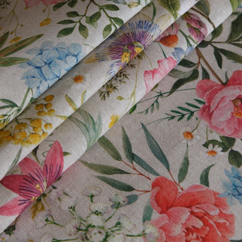 Декоративная портьерная ткань со смесовым составом и флористическим трендовым принтом от испанского производителя Visatex. Ткань средней плотности, приятная на ощупь, слегка фактурная из-за натуральных волокон. Интересный вариант для пошива штор, декоративных подушек и покрывал, изготовления текстильных элементов в кухнях-столовых, гостинных, спальнях и даже детских.