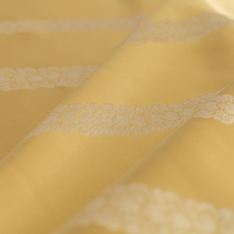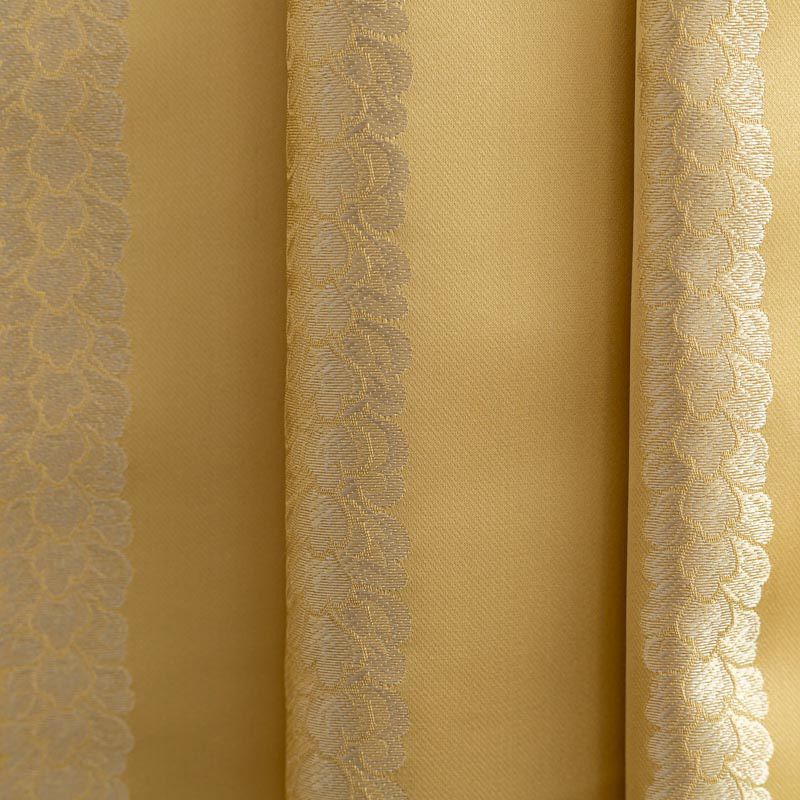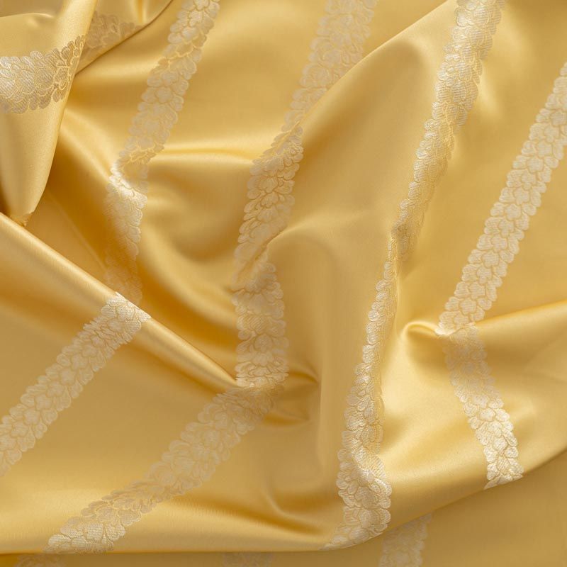 По своей структуре шелковые портьерные ткани являются мягким и красивым материалом, способным отражать свет. Изделия из шелка удивительно переливаются и блестят, придавая интерьеру помещения особую атмосферу и вид. Такие портьерные ткани лучше всего применять для создания покрывал, наволочек, штор, легких, воздушных и светлых – они отлично подойдут для затемненных мест либо закрытых окон. Шелковая ткань золотого оттенка с вертикальными полосками из мелких листиков прекрасно подойдет для помещений с невысоким потолком и широкими оконными проемами.