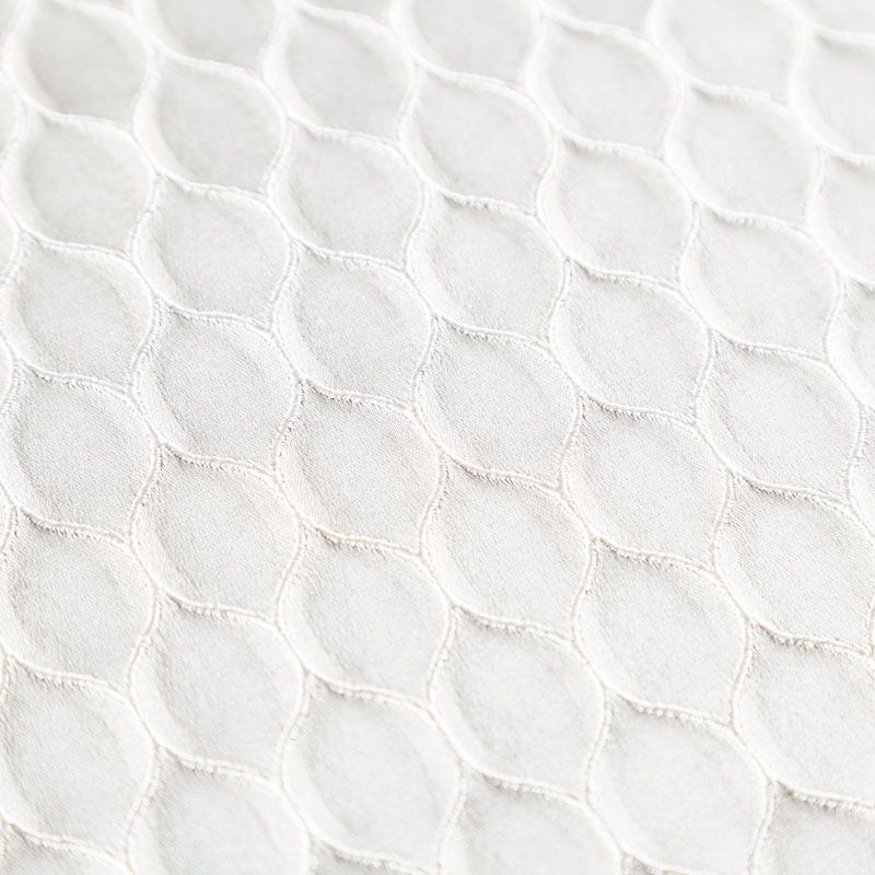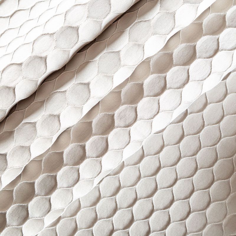 Стильная жаккардовая ткань из коллекции Неон известного бренда Fryett's с фактурной поверхностью, которая имитирует соты. Ткань средней плотности имеет сдержанный благородный блеск, прекрасно держит форму, драпируется в устойчивые складки. Подойдет для плотных штор, покрывал, подушек, скатертей, салфеток  и других элементов текстильного интерьера как в самостоятельном исполнении, так и качестве компаньона к цветным вариантам.