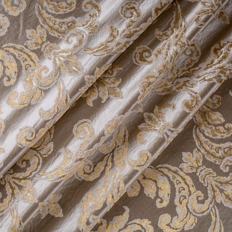 Итальянская жаккардовая портьерная ткань с добавлением натурального шелка в благородной золотистой цветовой гамме с цветочно-растительным орнаментом. Ткань хорошо драпируется. Будет уместна в декорировании интерьеров в стилях ар-деко, стилизованная классика, модерн. Подходит для пошива штор, ламбрекенов, покрывал, наволочек, чехлов на мебель и других элементов декора.