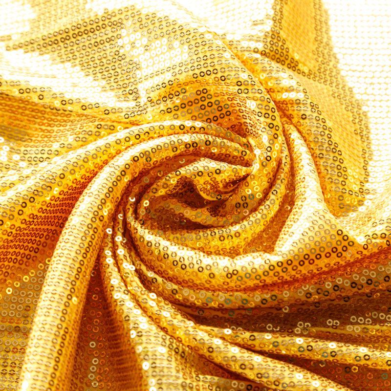 Блестящие пайетки в золотом цвете. Мелкие, размером около 2 мм. Основа - "холодное" тонкое трикотажное полотно, комфортное в носке. Ткань не прозрачная, тянется. Подойдет для вечернего, коктельного платья или юбки, комбинезона, топа, танцевальных и сценических костюмов.