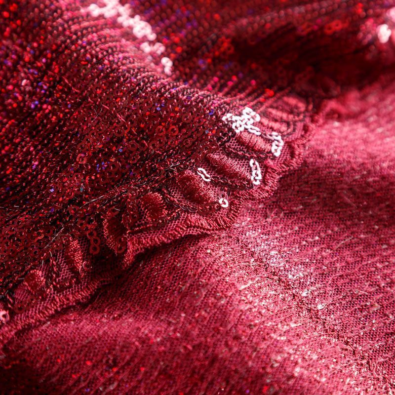 Эластичная сетка бордового оттенка по всей поверхности которой расположены глянцевые пайетки. Ткань очень хорошо драпируется, красиво переливается, имеет глянцевый блеск, пластичная, полоски расположены вдоль кромок, которые обработаны вышитым фигурным фестоном, набирается объемом,  Пайетки — идеальный материал для праздников и вечеринок. Из них получится эффектное платье, жакет, боди, туника, юбка или комбинезон.