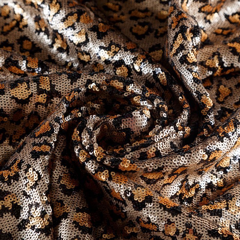 Пайетки с анималистическим узором в золотисто-черной гамме. Вышиты на черной эластичной сетке. Роскошно смотрится в блестящих нарядных комбинезонах, сверкающих платьях и искрящихся блузках, юбках, туниках, концертных костюмах, нарядах для танцев. На ощупь полотно не тяжелое, достаточно пластичное и удобное в носке.
