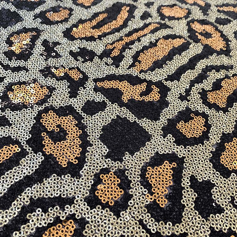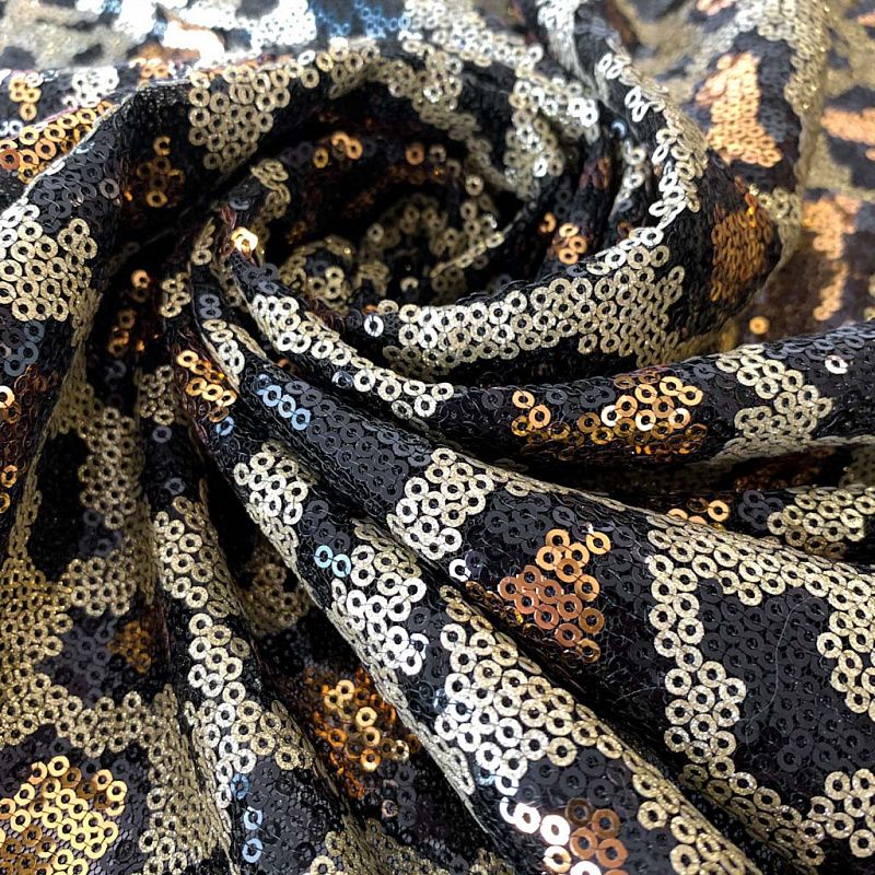 Пайетки в виде золотой шкуры леопарда с блестками. Вышиты на черной эластичной сетке. Роскошно смотрится в блестящих нарядных комбинезонах, сверкающих платьях и искрящихся блузках, юбках, туниках, концертных костюмах, нарядах для танцев. На ощупь полотно не тяжелое, достаточно пластичное и удобное в носке.