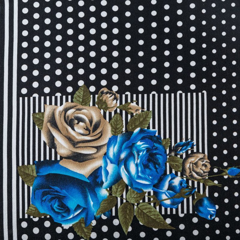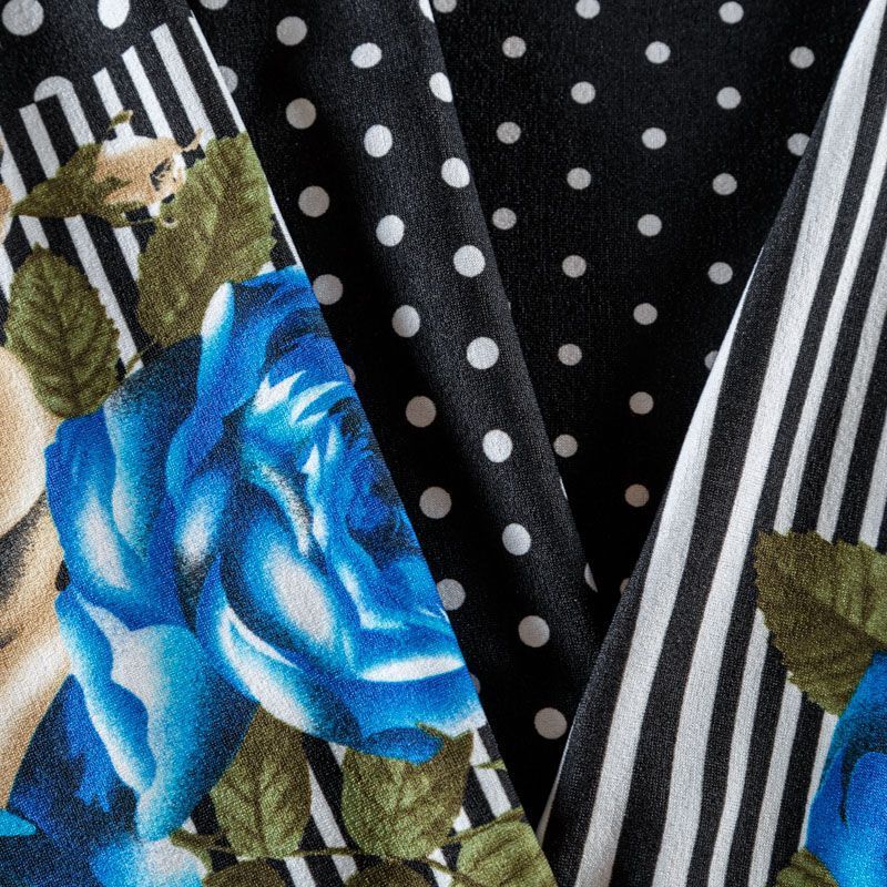 Трикотаж средней плотности, хорошо тянется за счет эластана в составе. Сочетание нескольких принтов образуют сложный цветочно-геометрический рисунок. Ткань не сухая, мягкая, не просвечивает, теплая, хорошо драпируется. Отлично подойдет для пошива платья, кардигана, свитшоша, лонгслива, мягкого жакета, юбки.