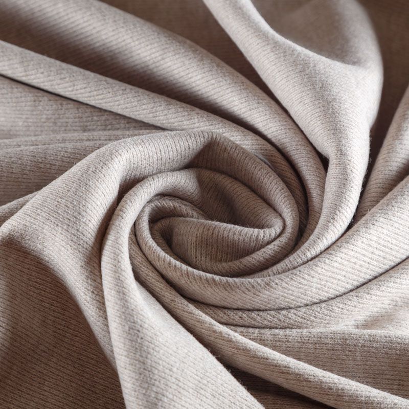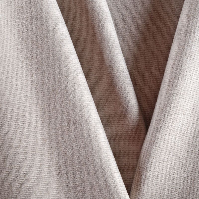 Вязаный трикотаж холодного бежевого оттенка средней плотности, упругий и прочный, держит форму, при этом хорошо тянется в поперечном направлении. Отлично подойдет для пошива легкой верхней одежды, жакета, кардигана, брючного костюма, юбки или платья.