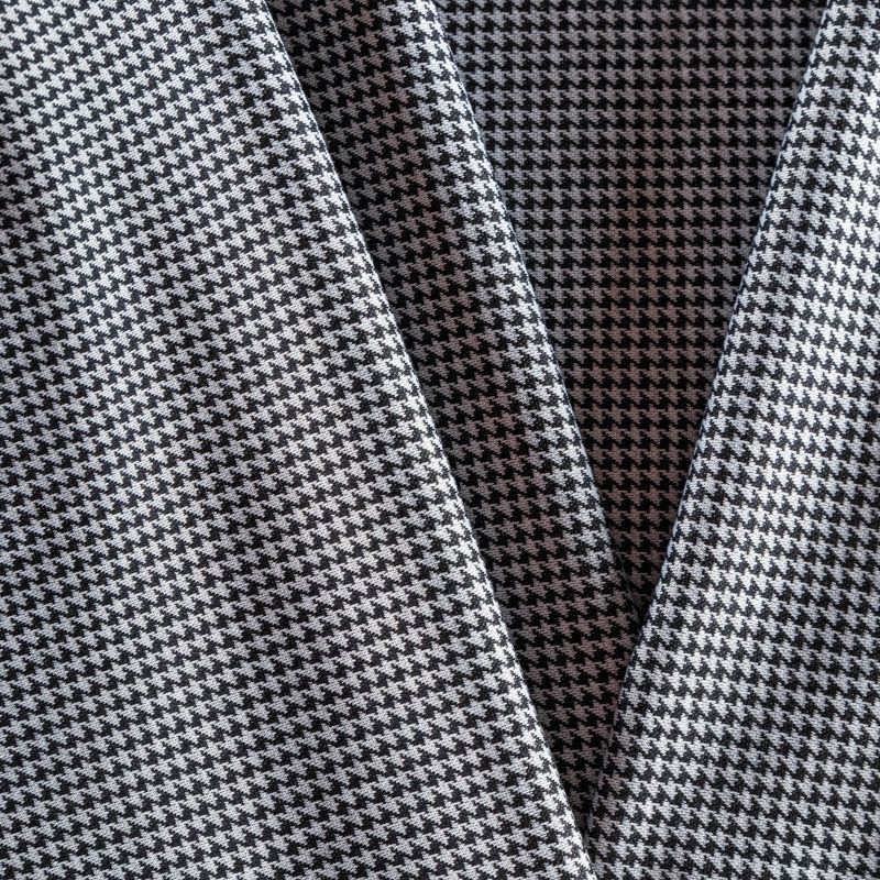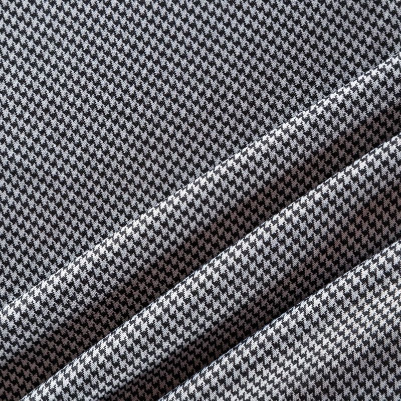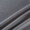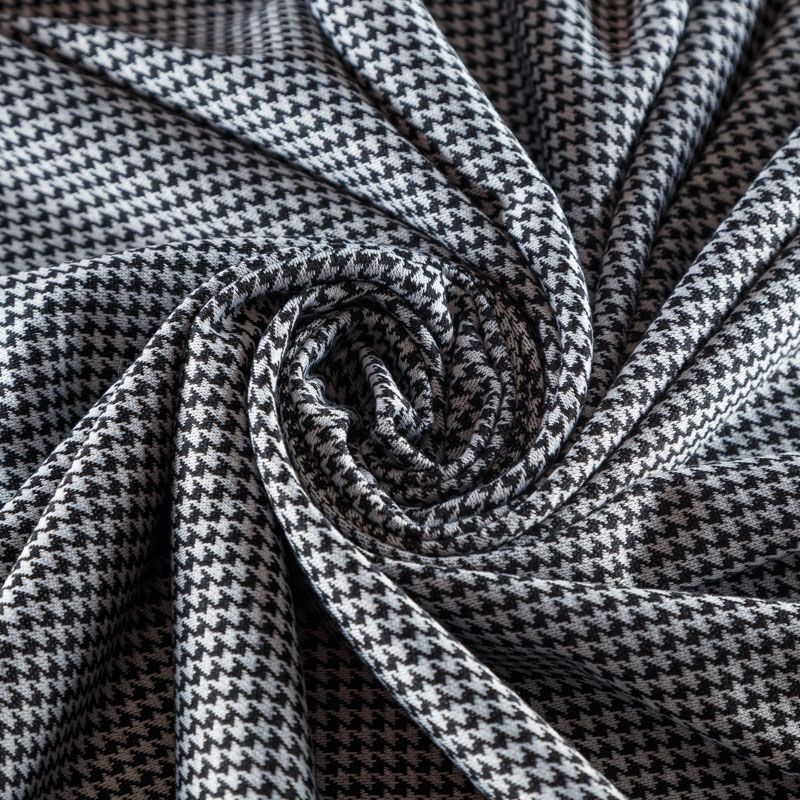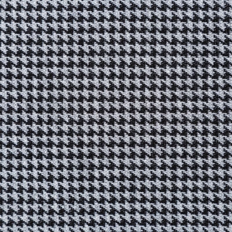 Трикотаж средней толщины, хорошо тянется за счет эластана в составе. Мелкий ненавязчивый геометрический орнамент образуется переплетением черных и белых нитей. Ткань не сухая, мягкая, но плотная, не просвечивает, теплая, хорошо драпируется. Отлично подойдет для пошива легкой верхней одежды, жакетов, костюмов, юбок.