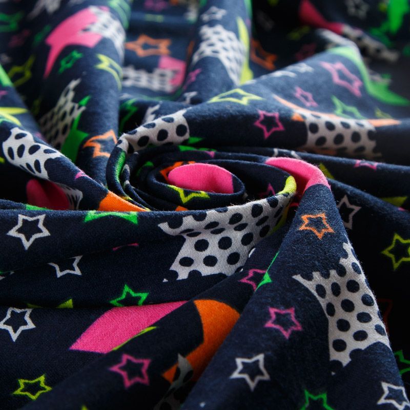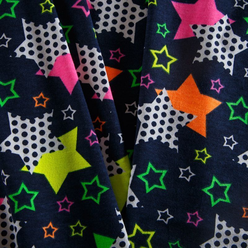 Мягкий трикотаж с ярким принтом на хлопковой основе с добавлением эластана. Полотно средней плотности, эластичное, достаточно пластичное, с лицевой, и с изнаночной стороны гладкая, приятная к телу. Кулирка отлично подходит для пошива нижнего белья, изделий для детей, а также для спортивной и домашней одежды, пижамы.