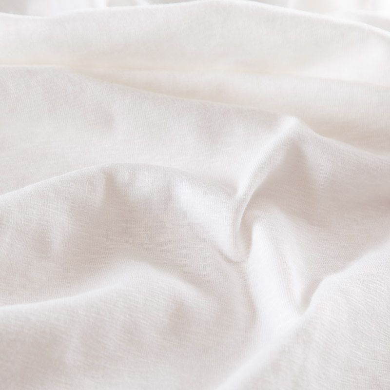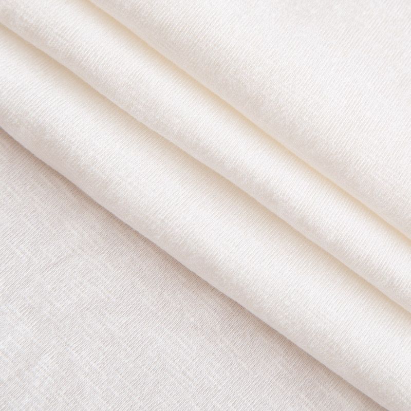 Итальянский хлопковый трикотаж молочного оттенка. Поверхность полотна фактурная, шероховатая, немного просвечивает. Подойдет для пошива футболок, лонгсливов, топов, туники, платья.