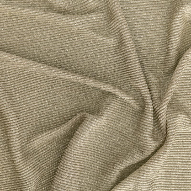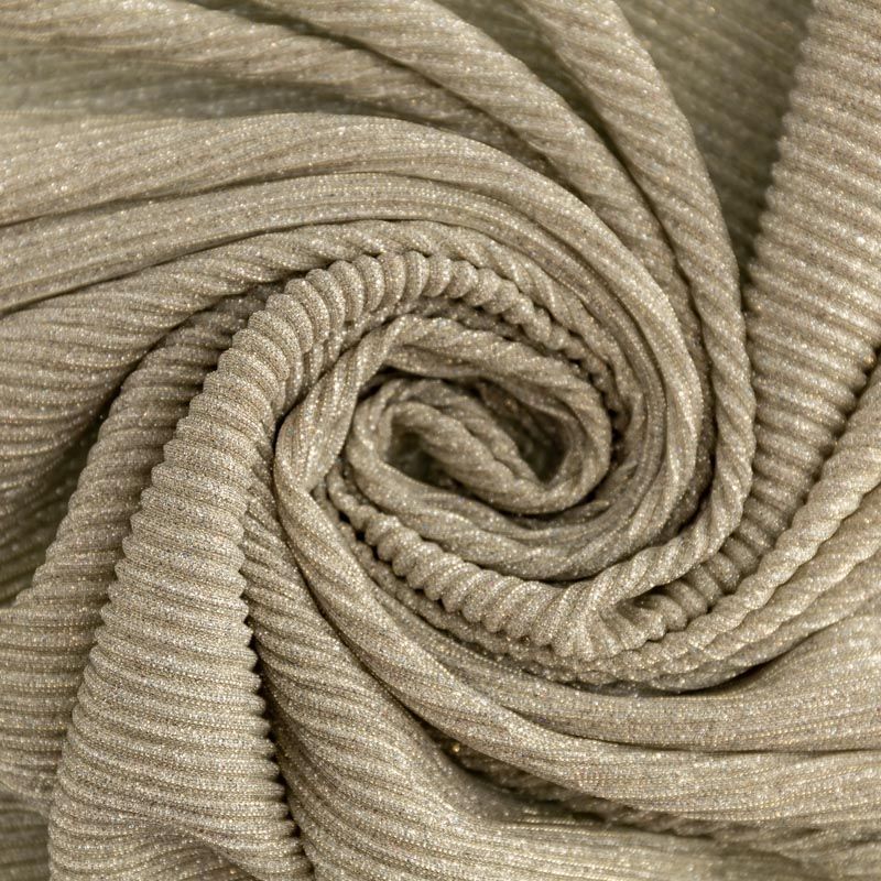 Легкая, слегка прозрачная ткань, с высокой степенью эластичности, поверхность рельефная за счет эффекта гофре и мерцающая за счет напыленного  люрекса. Идеальна для облегающих изделий с использованием подклада, платья, топа, юбки, брюк, кардигана. Полоски гофре расположены поперек кромки, набирается объемом.