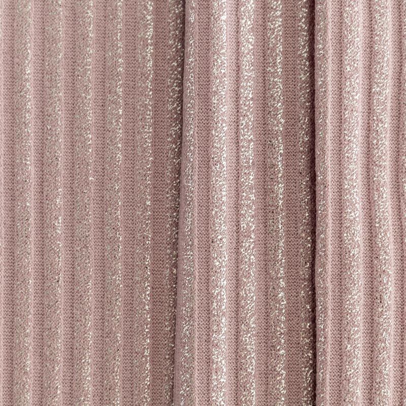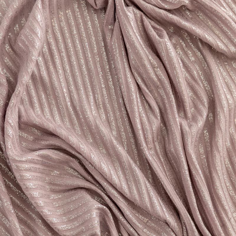 Трикотаж-лапша средней плотности, с высокой степенью эластичности, поверхность рельефная за счет эффекта резинки и мерцающая за счет металлизированного напыления. С изнанки трикотаж гладкий, комфортный, подходит для использования без подклада. Сшить из такого полотна можно водолазки, платья, топы, юбки, комплекты, нарядные изделия. Направление полос - вдоль линии кромки.