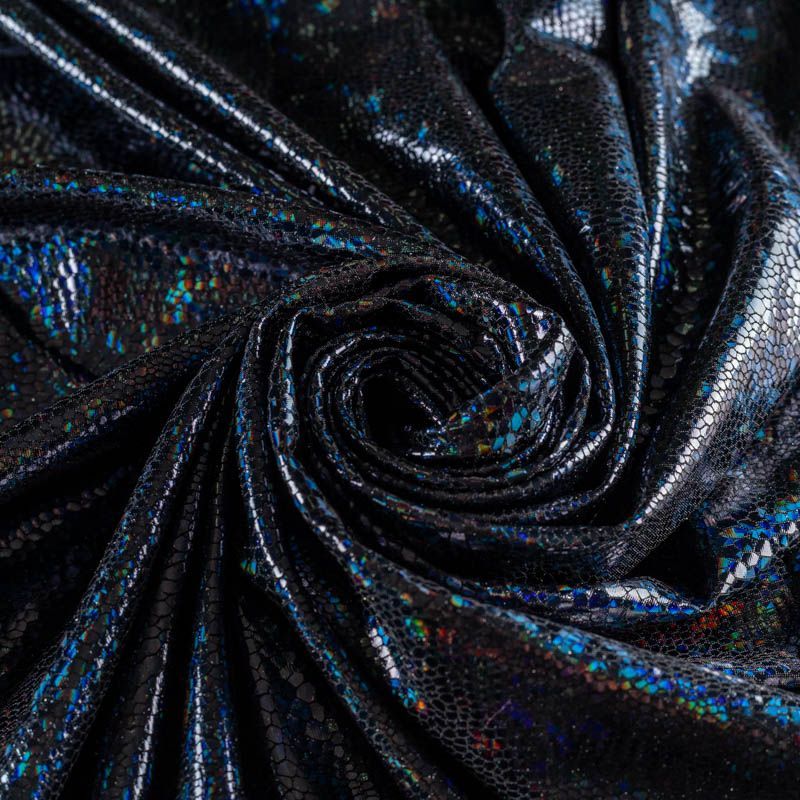 Эффектное трикотажное полотно с напыленными разноцветными блестками. Поверхность фактурная с рисунком под рептилию, который не деформируется при растяжении трикотажа. Материал очень пластичный, образует струящиеся мягкие складки, отлично тянется, не просвечивает, не мнется. Изнаночная сторона матовая, приятная на ощупь. Идеальный выбор для нарядных моделей, гимнастических и танцевальных костюмов.