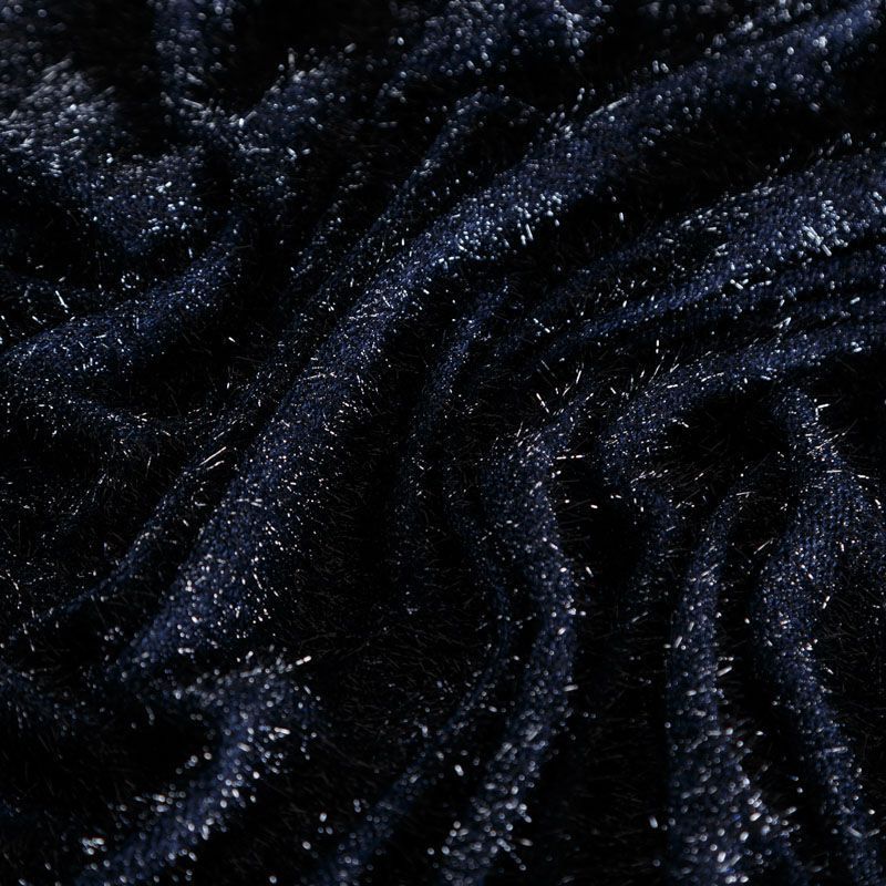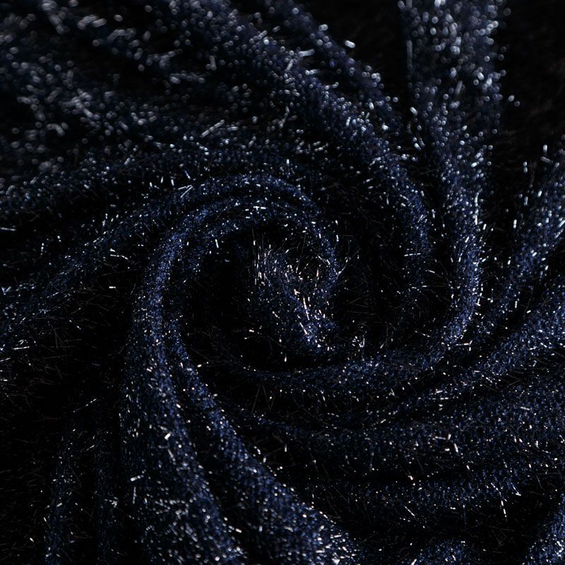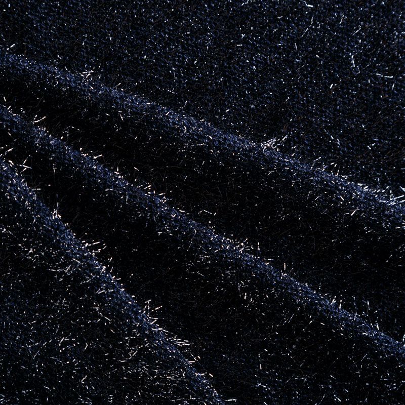 Нарядный трикотаж с люрексом в темно-синем оттенке. Полотно мягкое, пластичное, хорошо драпируется, не колется и не просвечивает. Подойдет для пошива логслива, топа, туники, платья, кардигана, юбки.
