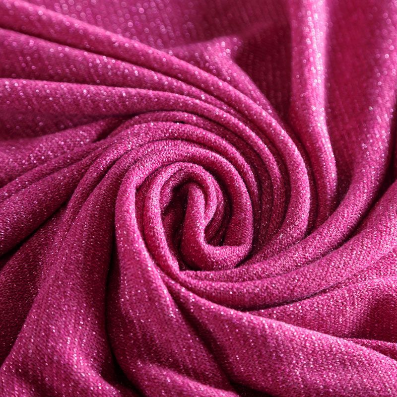 Мягкое и эффектное трикотажное полотно с металлизированным деликатным блеском. Структура полотна плотная, легко растяжимая, эластичная. С лицевой стороны поверхность ткани слегка шероховатая на ощупь, с изнанки трикотаж гладкий, комфортный, подходит для использования без подклада. Отлично пододет для пошива водолазки, платья, топа, леггинсов, спортивных купальников, нарядных изделий.