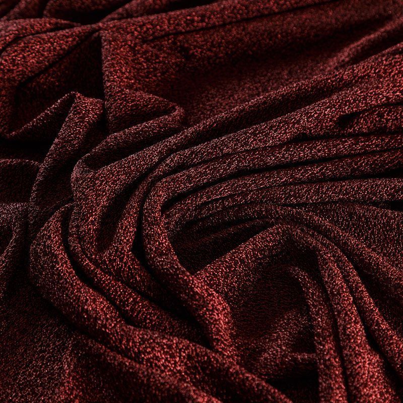 Трикотажное полотно с металлизированным блеском и мерцанием. Люрексные нити бордового оттенка вплетены в структуру полотна и создают объемный "вспененный" эффект, при этом изнанка гладкая и ровная. Ткань очень приятная к телу, не колется, не просвечивается, очень эластичная, отлично драпируется и ниспадает, красиво ляжет по фигуре. Идеальный вариант для пошива вечерних и нарядных платьев облегающего силуэта, топов, комбинезона, юбки, широких брюк, туник, кардиганов, накидок.