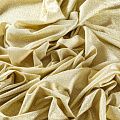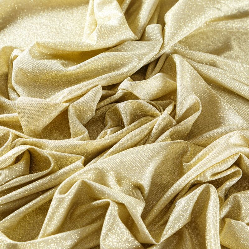 Трикотажное полотно средней плотности с добавлением золотистой люрексной нити. Поверхность шероховатая на ощупь, ткань пластичная, хорошо тянется, не просвечивает. Прекрасно подойдет для пошива лонгслива, гольфа, футболки, кардигана, жакета, платья или юбки в спортивном стиле.
