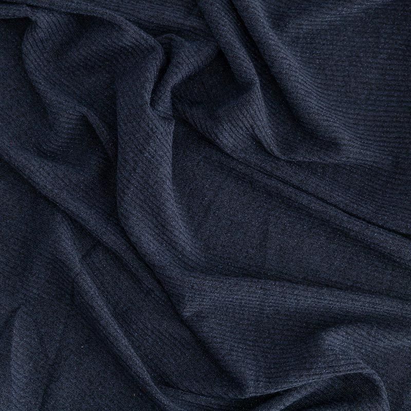 Трикотаж-лапша темно-синего цвета с люрексовой нитью. Мягкая и эластичная ткань, великолепно драпируется и красиво облегает. Прекрасно подходит для изделий по фигуре, а также нарядов с мягкими складками. Трикотаж можно использовать для вечерних образов — платья, блузки, топы, кардигана и боди.